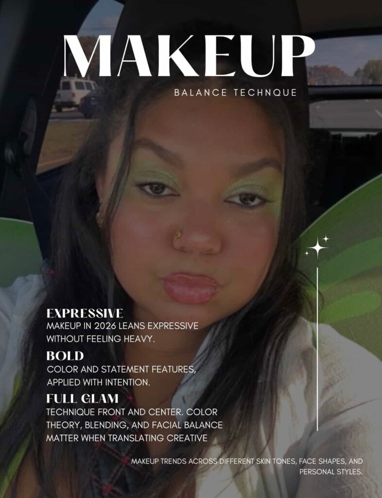 Makeup in 2026 leans expressive without feeling heavy. Bold color and statement features are showing up more often, but they’re applied with intention. Instead of full glam across every feature, many looks focus on one standout area while keeping the rest balanced.